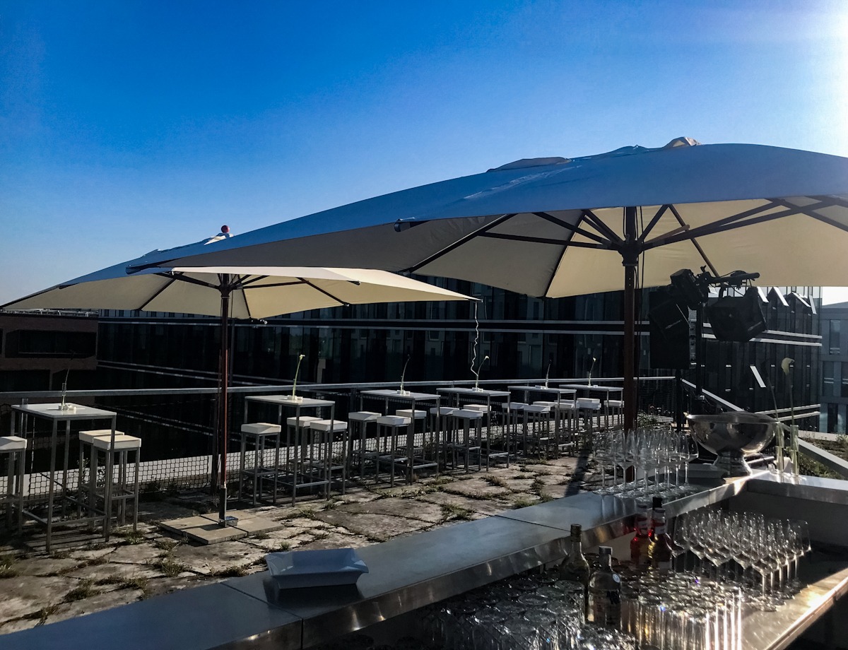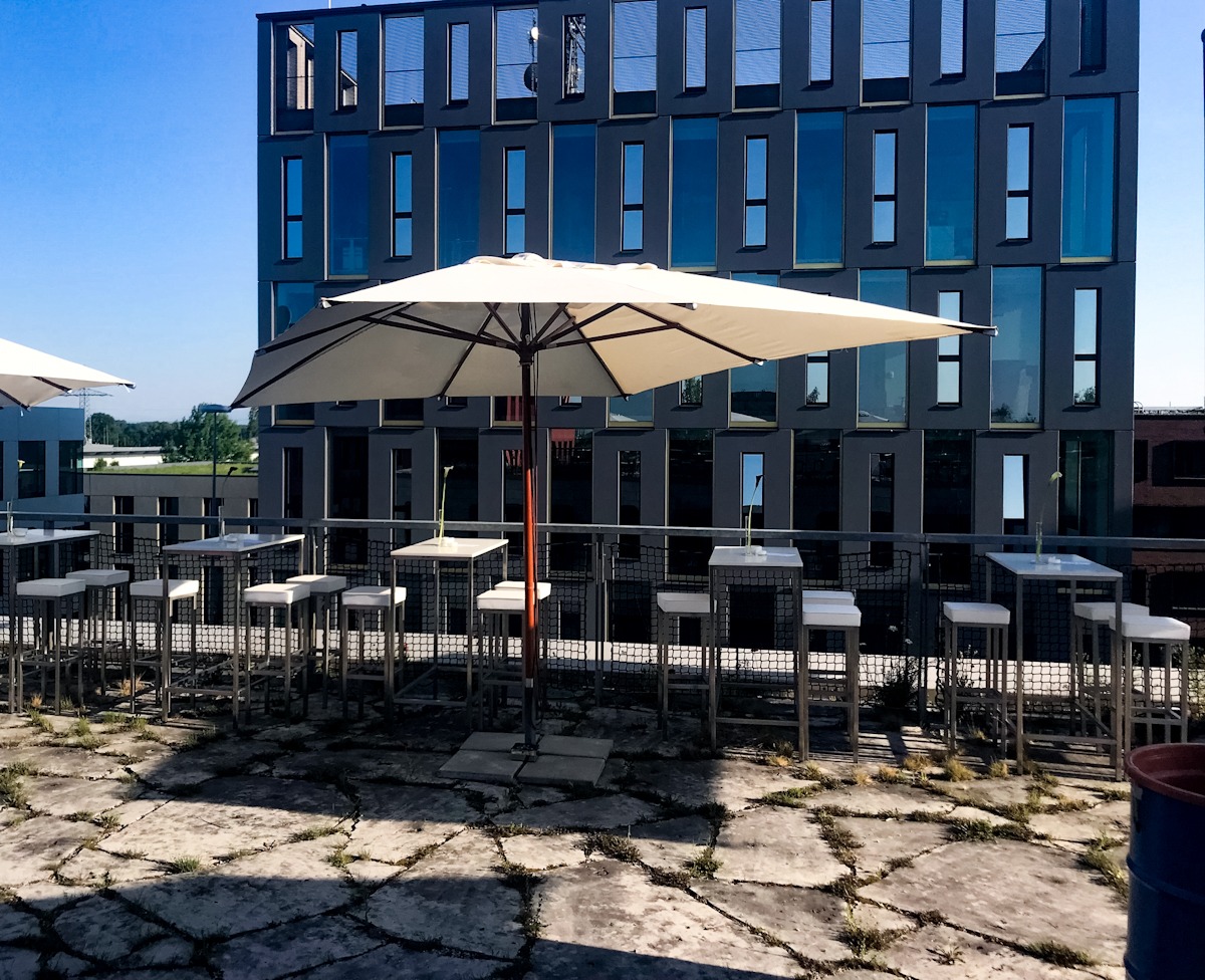 Auf unserer 120 Quadratmeter großen Dachterrasse feiern und netzwerken Sie buchstäblich auf höchstem Niveau. Hier finden Sie den idealen Rahmen für einen entspannten Empfang, ein sommerliches Get-together oder einen stimmungsvollen Sundowner an der frischen Luft.